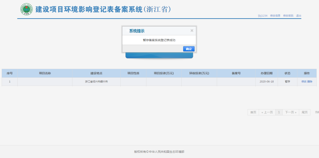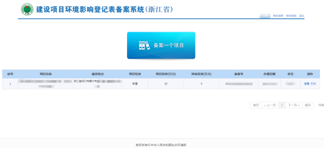 点击【保存】,弹出确认提示框,需要仔细阅读提示信息,在提示框上点击【确定】 进入项目信息确认页面,如需修改信息,点击【修改】返回编辑页面;如信息确认无误,点击【提交】,弹出确认提交提示框,在提示框上点击【确认】 弹出登记表提交成功提示框,生成备案号同时对外公示,并进入登记表预览页面,在提示框上点击【确认】,提示框关闭。 点击【打印】,将登记表下载到本地,法定代表人签字备查,点击【返回】,返回数据列表,项目状态为“已公示”。